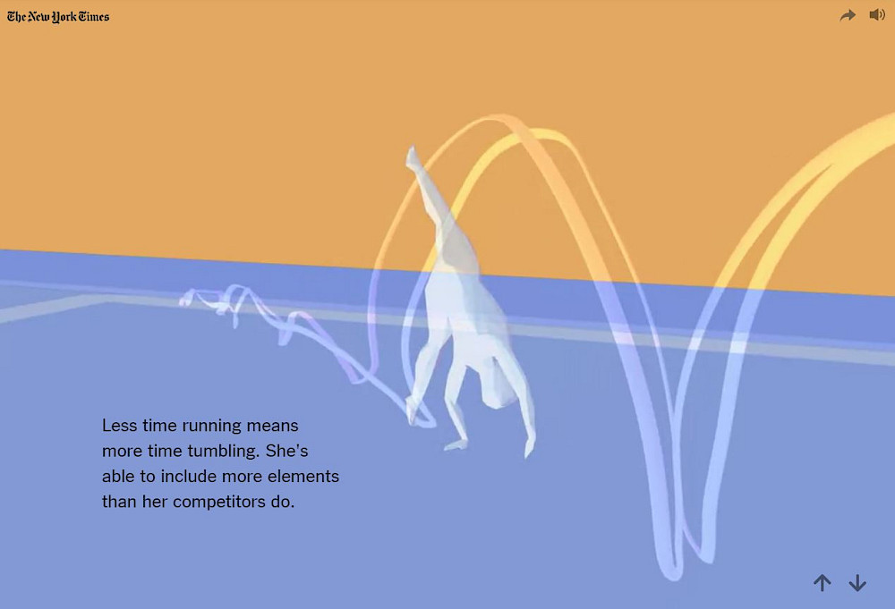 Athletes' Profiles: Moving beyond the traditional profile, The New York Times created an interactive slideshow graphic combing informative text, interview quotes, and video analysis. By examining the athletes' physique and technique in detail, these profiles explain how the athletes are are able to achieve their athletic feats. Four leading athletes are profiled: gymnast Simone Biles; high-jumper Derek Drouin; swimmer Ryan Lochte; and triple jumper Christian Taylor.