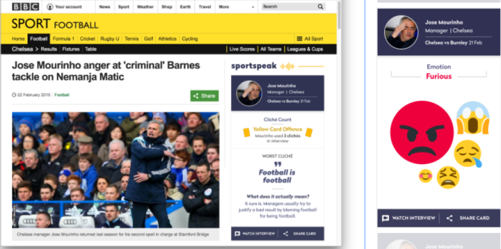 The winning team was from the BBC (Nassos Stylianou, journalist, Joy Roxas, UX designer; and Alvin Ourrad, developer) with their prototype sportspeak. “'Sportspeak' is a tool allowing journalists to input text from sports interviews and get embeddable and socially shareable cards analysing the tone, language and cliché use of the interviewee. The emotion is then visualised via emojis." Stylianou said. "The goal is it is to enable sports journalists to create fun, socially shareable content for our audience, we can also explain some of the clichés. It adds values to a lot of interviews, often long and full of clichés, making them more fun and engaging.”