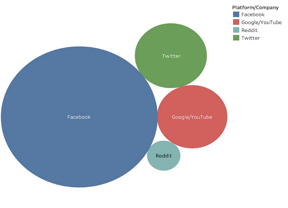 The database shows that Facebook has released the most information about disinformation campaigns, followed by Twitter, Google, and Reddit.