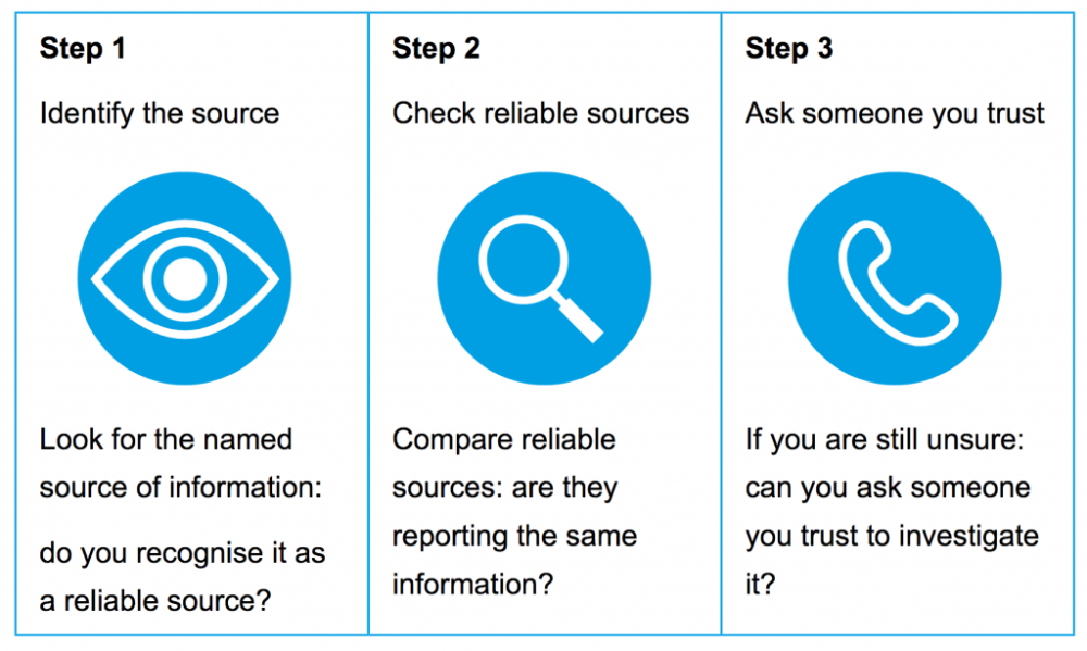 Older people are advised to check the reliability of information by following three steps: identify the source, compare reliable sources, and ask for help if necessary.