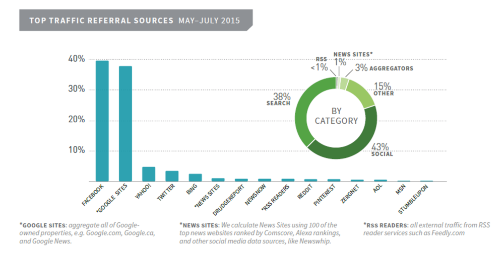 Although Google remains the primary driver of overall search and referral traffic, Facebook has doubled its share of news referral traffic from just 20% in January 2014.