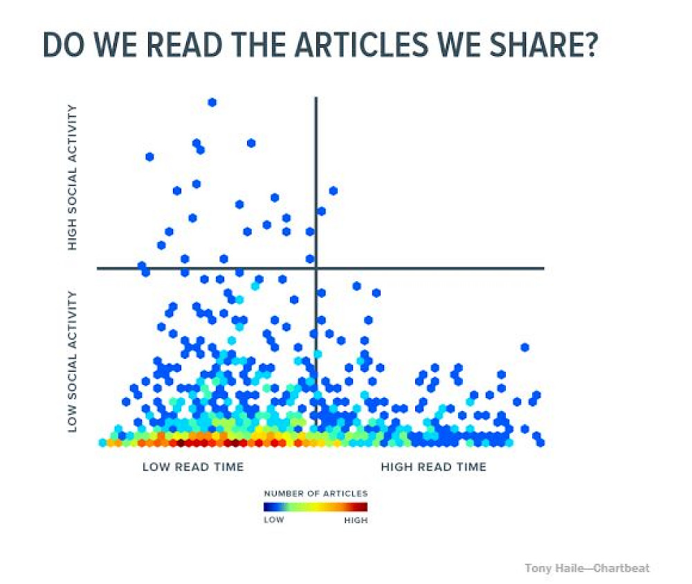 In an analysis of 10,000 socially shared articles, Chartbeat’s Tony Haile found no relationship between social sharing activity and the amount of time average readers will give to the content. This matters because publishers chasing social clicks are often ignoring their most important audience: those who not only want to engage with news but also want to do it via a specific publisher.