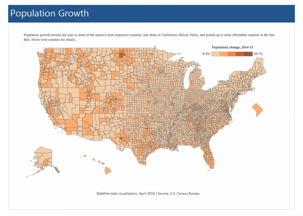 In The Washington Post, Christopher Ingraham highlights an interesting example of how data visualisation can be misleading when colours schemes are used inappropriately. Taking data on US population change 2014-2015, he contrasts how Pew represented the data with his own version.